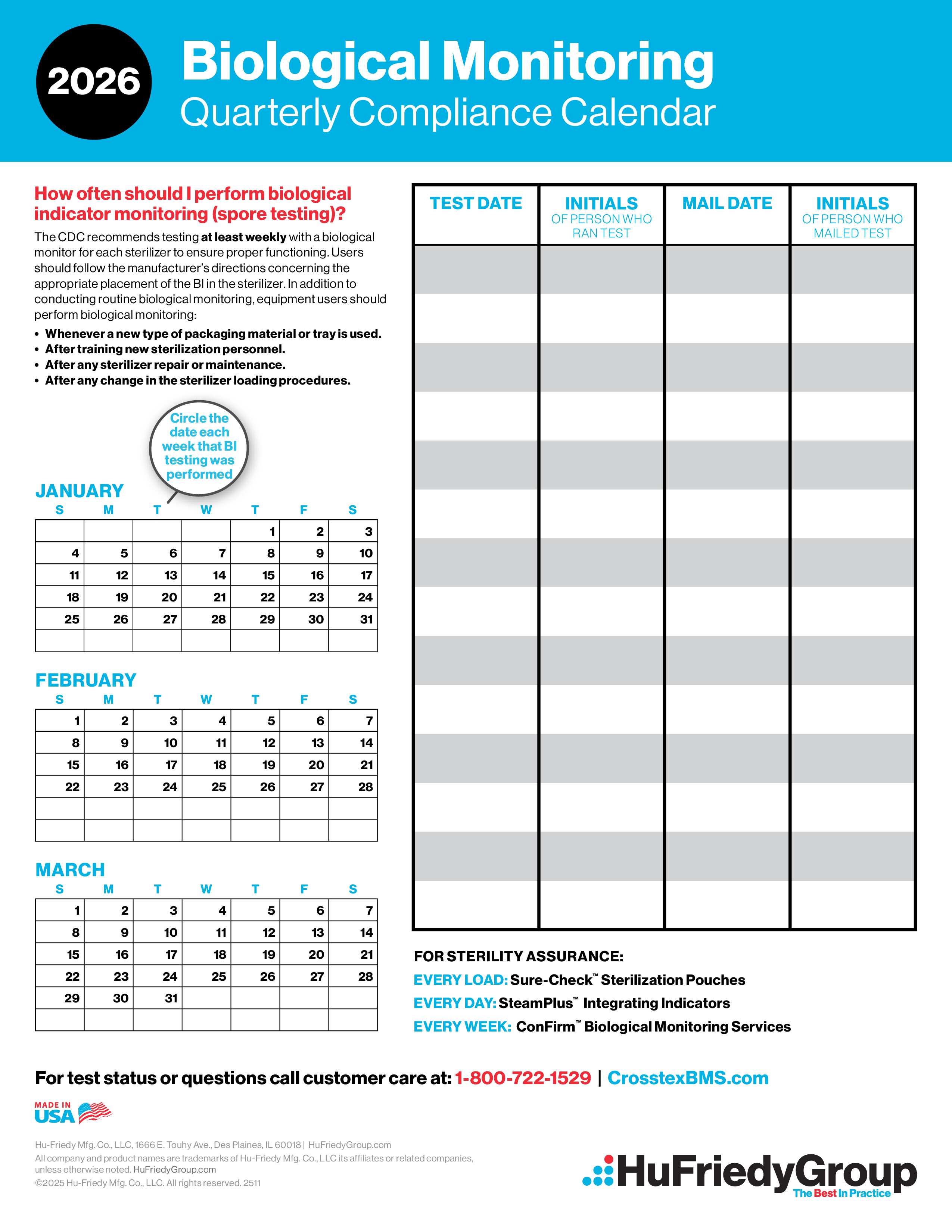 PDFKeep track of sterilization procedures to protect your practice & your patients. Biological monitoring, conducted at least weekly in the US, is key to a successful sterility assurance and risk management program.Please check state recommendations for additional information. Visit: cdc.gov or aami.org. Use as tangible records when proof of testing is required. Format developed for use as hanging in-practice wall chart.